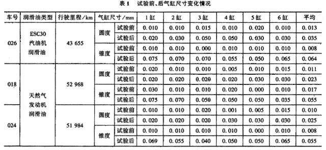 该汽车5万km道路试验前、后气缸尺寸变化以及燃烧室部件腐蚀与磨损情况分别列于表1和表2。